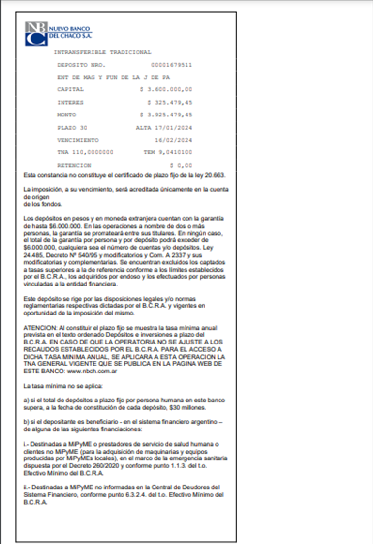 Se constituye un Plazo Fijo Tradicional por la suma de$ 3.600.000,00 por 30 días (vence el 16/02/2024). Se obtienen de Intereses la suma de $ 325.479,45.