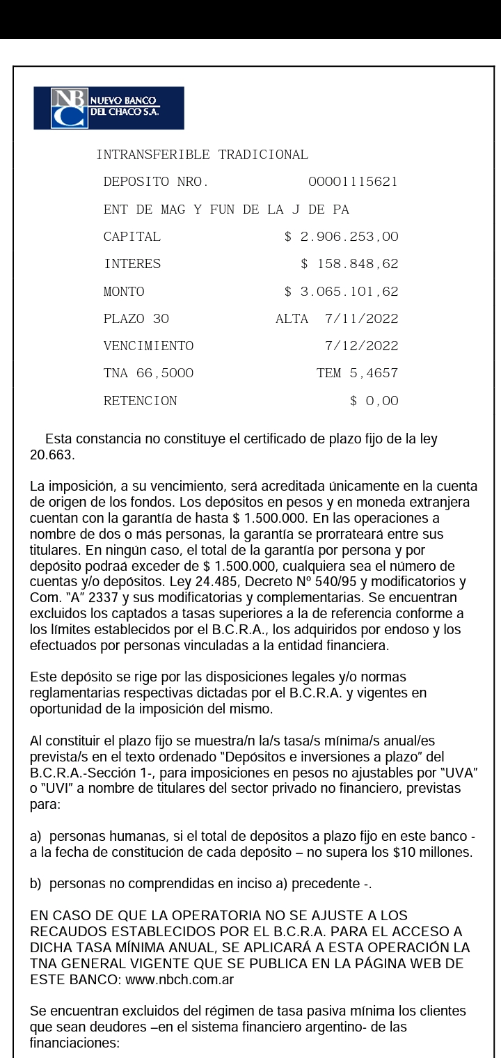 Se constituye un Plazo Fijo Tradicional por la suma de 2.906.253,00. Por 30 días (vence el 7/12/2022). Se obtienen de Intereses la suma de $ 158.848,62.