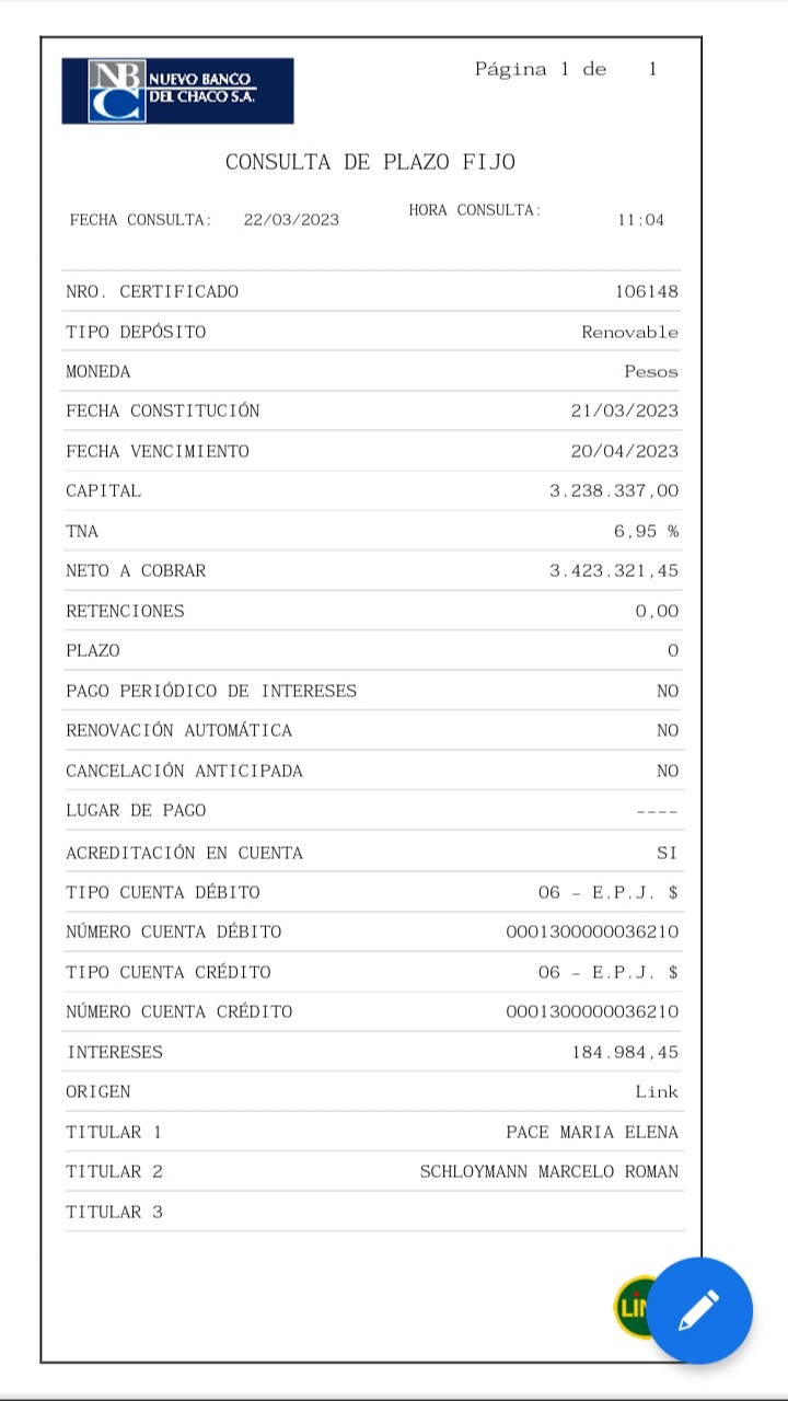 El día 21 de marzo pasado se constituyó plazo fijo (por 30 días) correspondiente al mes de marzo del 2023.