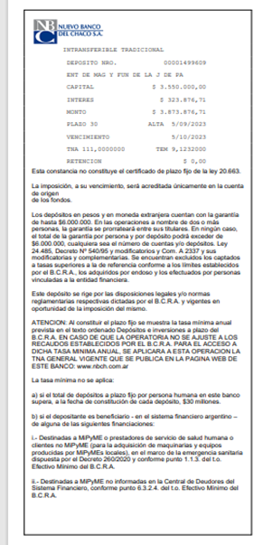 El día de la fecha se constituyó plazo fijo (por 30 días) correspondiente al mes de septiembre del 2023.