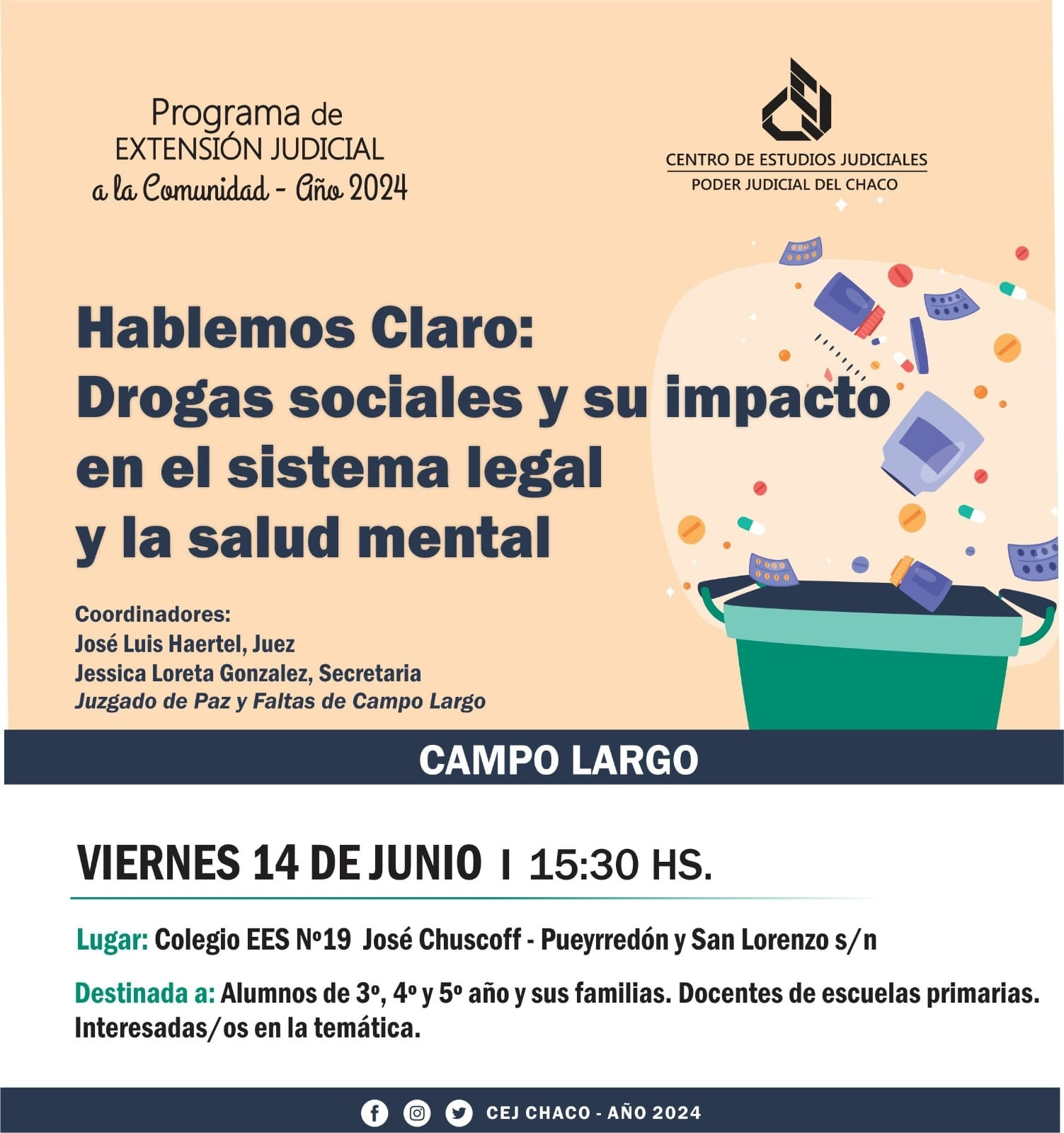 El día viernes 14 de Junio de 2024 a partir de las 16 a las 20 hs en las instalaciones del colegio Secundario EES N 19 Jose Chuscoff de la localidad de Campo Largo , se llevará a cabo la Charla bajo el título: "HABLEMOS CLARO , DROGAS SOCIALES Y SU IMPACTO EN EL SISTEMA LEGAL Y DE SALUD MENTAL" estará destinado a varios establecimientos educativos y una reunión de todos los actores que intervienen en la problemática a fin de aunar criterios de actuación. Estará destinado en una primer etapa a estudiantes secundarios de 4 y 5 año y sus familias con 2 hs de duración donde se dará a conocer la Ley de Salud Mental así también como intervienen las fuerzas de seguridad, el juez , los operadores de salud y distintos centros terapéutico de atención de consumo problematico. Una segunda etapa consistirá en una reunión interpoderes local de 19 a 20 hs para coordinar y establecer mecanismos de intervención y estrategias de abordaje, unificando criterios de actuación y de trabajo intersectorial para asistir a tiempo ante situaciones tan complejas.